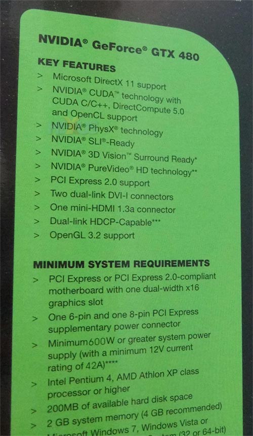 Как сообщает сайт Legit Reviews, для работы с одиночной видеокартой GeForce GTX 480 производитель рекомендует использовать блок питания мощностью не менее 600 Вт, способный обеспечить силу тока не менее 42 А по линии 12 В. Для сравнения сообщим, что Radeon HD 5970 требует блока питания мощностью 650 Вт, а одиночная видеокарта GeForce GTX 285 - блока питания мощностью 550 Вт. Нельзя сказать, чтобы GeForce GTX 480 разительно отличалась от этих продуктов в плане энергопотребления.