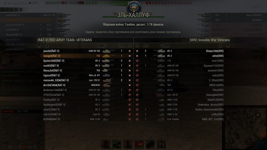 | Мировая война: Гамбия, десант, 1/16 финала Завершено: 03.12.2013 23:27:32 [RAT-V] RED ARMY TEAM- VETERANS vs. [WIV] Invisible War Veterans Победа! |