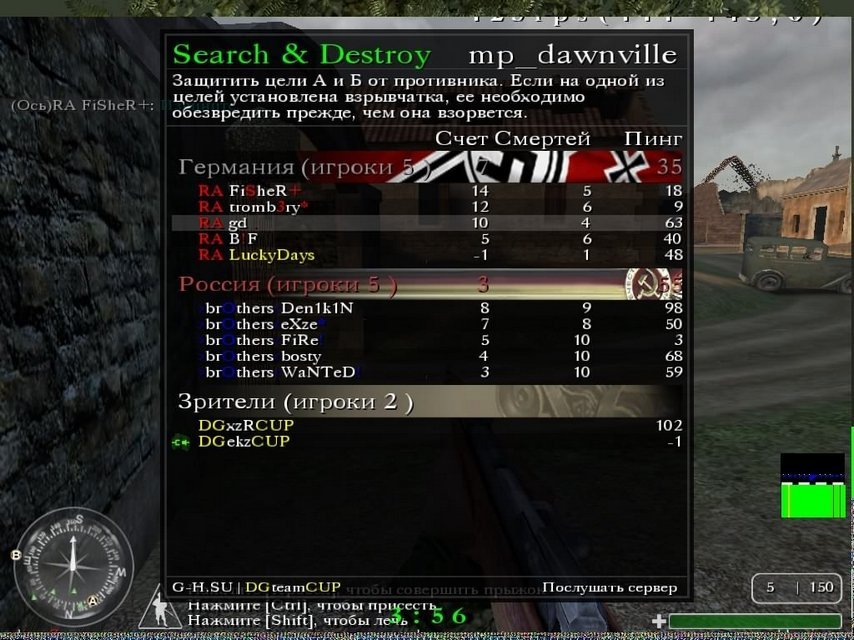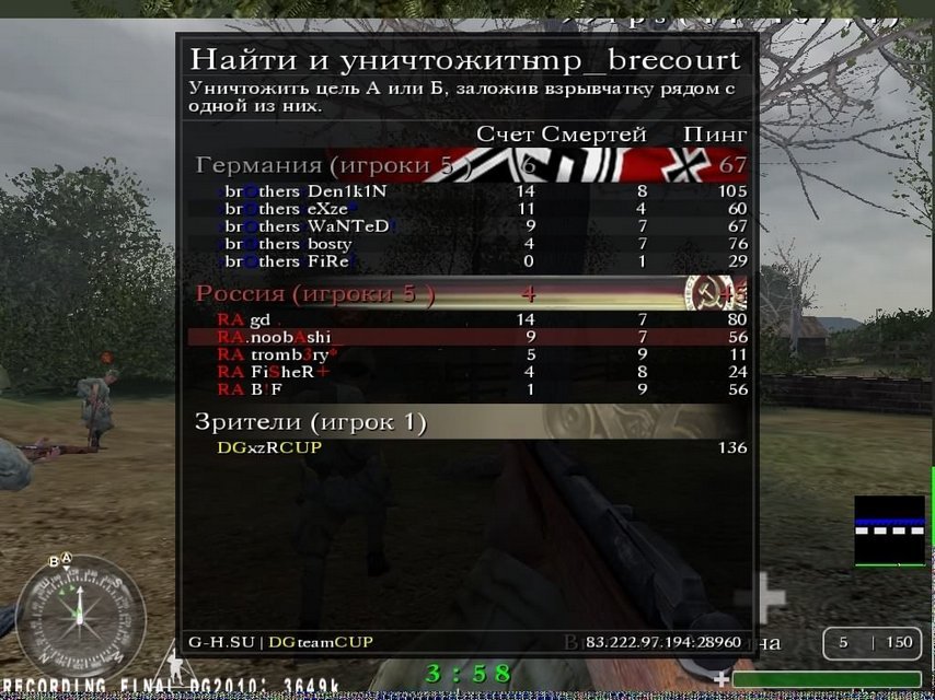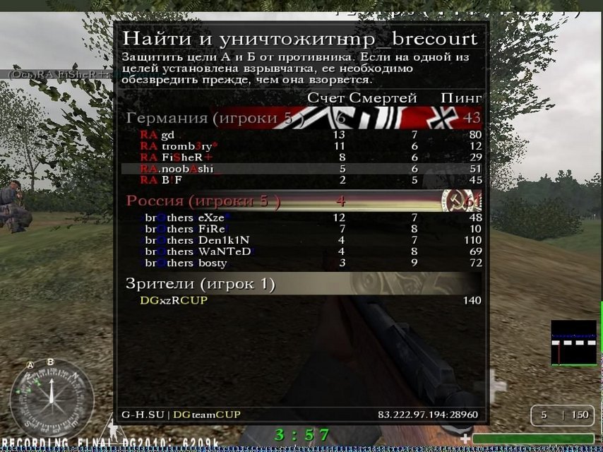 | И так, немного о финальной игре. Вычеркиванием карт предопределили 2 карты brecourt & daunwille, причём радовались в \"конфе\" больше зелёной карте нежели даунвилю. Игра на \"бреке\" показала что данным составом у нас не были наигранны простые элементы что за защиту что за нападение (не знали что-кому держать), да и честно сказать мы на ней уже давным давно не играли (не для кого не секрет что брек наша коронная карта) тогда как соперник её уже давно играет на кланварах. Дали бой, причём начиная за нападение нас попросту расстреливали в итоге боевая ничья с аналогичным счётом с обеих сторон 6-4, 4-6. Дунвиль был начат с выигранного баш-раунда , что оказалось не маловажным событием потому как он предопределил сторону удобную для нас а именно защита, в итоге не без ошибок и не без нервозности взяли первую сторону 7-3 (17-13). За нападение оставалось лишь взять 4 очка, что в принципе нам удалось, благодаря рейдам через площадь* (центральная точка на карте). У соперников выделю игру Denikina, особенно защита на бреке. За себя (noobashi) скажу - что игра не шла, сказалось то что выложился больше на другом принципиальном кланваре против д`ганз, в финальной же игре всё шло мимо и не туда. Игра держалась на Максиме, Жене и Серёге (так же Паша не подвёл заменив меня на последней стороне 2 карты). Бывает такое что если у тебя не получается что-то у соклановчев найдётся второе дыхание подстраховать тебя или выложится вдвойне, за что им и спасибо. |