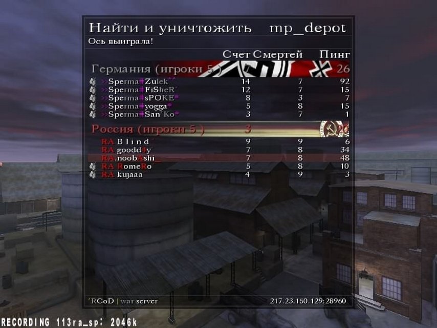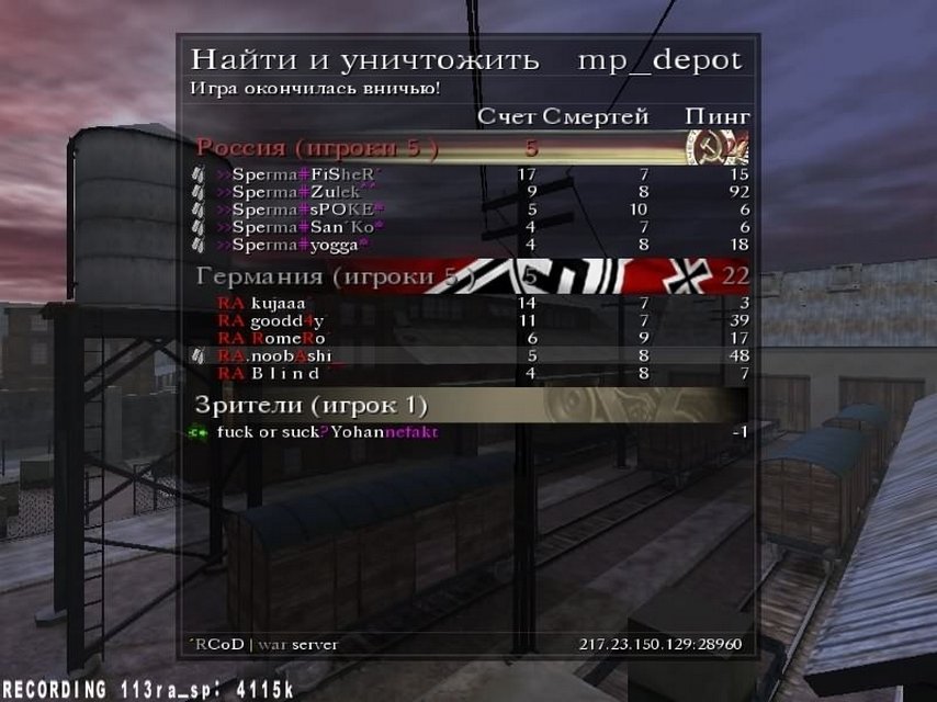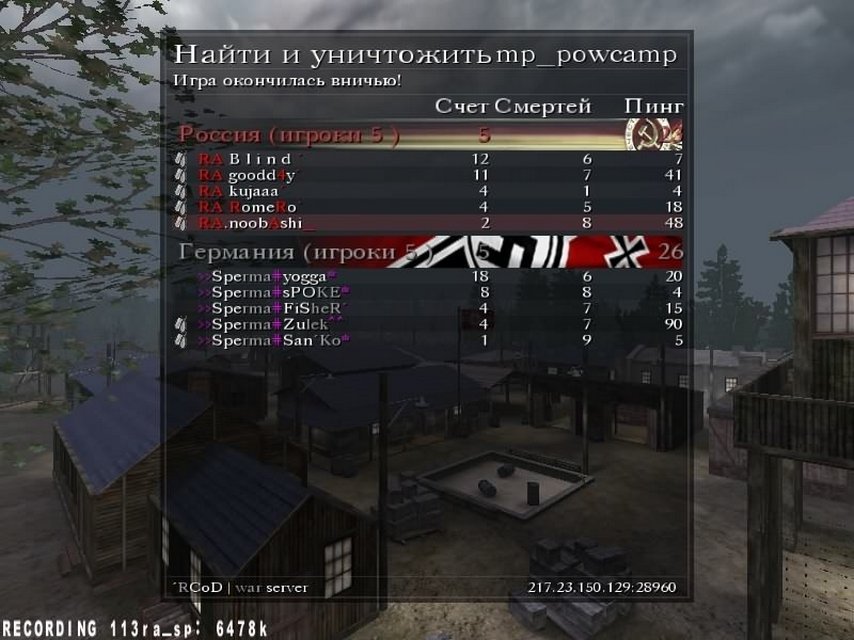 | Итак подитожу вкратце: основной причиной поражения являлись тех. проблемы как минимуму 2их игроков нашей команды; не всё было гладко с командным взаимодействием. Надо сказать что противостояние с данной командой (по предварительному подсчёту) составляет 18 игр из которых это первое поражения для RA. Так же хочу подчеркнуть что сухая серия составила 112 игр(с 2 ничейными результатами) не учитывая игры с миксами и командами которые себя не зарекомендовали в CoD 1. |